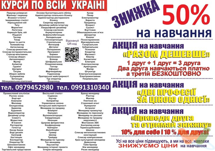 Курси кухар, кондитер, сушіст, піцайоло, пекар, бармен, бариста, офіціант, перукар, манікюр та педикюр, візажист, косметолог, майстер татуажу, дієтолог, психолог, татуаж, нарощування вій, бровіст, грумінг, електромонтер, електромонтажник, електрик, електрослюсар, електрогазозварник, маляр, штукатур, плиточник, муляр, бетонник, арматурник, покрівельник, тесляр, токар, телемайстер, автослюсар, слюсар-ремонтник, слюсар-інструментальник, слюсар-монтажник, слюсар-збирач, слюсар-сантехнік, стропальник, акумуляторник, асфальтобетонщик, гіпсокартонщик, бляхар, обвалювальник м’яса, піскострумник, фрезерувальник, газорізальник, холодильщик, стропальник.