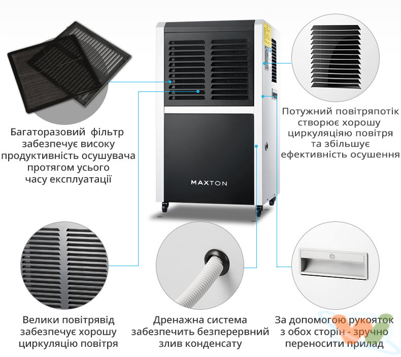 Maxton MX-60L – оптимальний вибір для складів, офісних центрів, промислових приміщень і великих житлових просторів. Забезпечте захист вашого приміщення від зайвої вологи вже зараз!