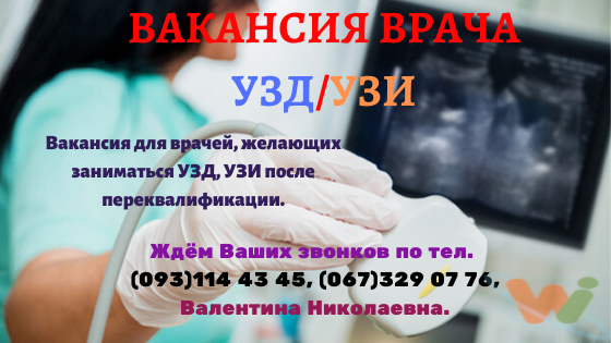Работа для врачей в Украине, вакансия-врач УЗИ, работа врачом УЗД. Требуются на работу врачи в частный кабинет УЗИ (УЗД)! Помогаем со специализацией и в обретении навыков! Официальное трудоустройство. Вакансия для врачей, желающих заниматься УЗД, УЗИ после переквалификации. Работа в районных центрах Черкасской, Полтавской, Киевской, Винницкой областей. Зарплата — 30% от выручки, в зимний период достигает 17000 грн мес и более. На работу ВРАЧОМ в кабинет УЗД приглашаются мужчины и женщины, стаж работы- значения не имеет, полная занятость, работа в частном кабинете с 8.00-15.00, гибкий график, воскресенье-выходной. Раcсмотрим кандидатуру врача-интерна. Ждём Ваших звонков по тел. (093)114.43.45, (067)329.07.76, Валентина Николаевна.