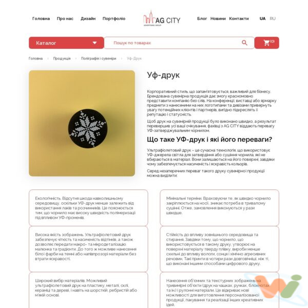 УФ-друк на різних матеріалах — це саме те, що необхідно вашому бізнесу для підвищення розпізнаваності, створення унікального бренду і привертання нових клієнтів. Команда професіоналів з «AGCity» готова надати якісні послуги УФ-друку на різних заготовках, адаптованих під ваші потреби. Завдяки високотехнологічному обладнанню та досвіду, ми гарантуємо неперевершену якість і задоволення від кінцевого результату.