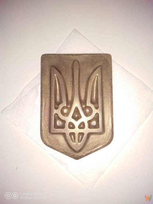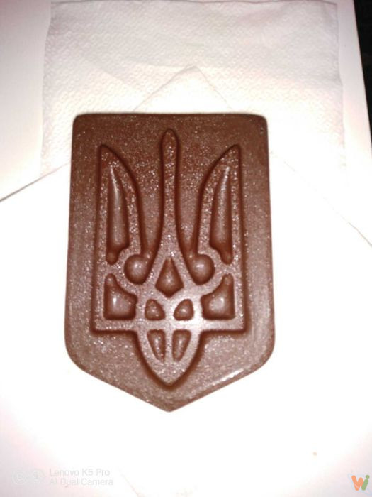 шоколадка ввиде герба Украины – размер 76мм*110мм, Вес 80грамм, стоимость – 60грн.шт. с золотым или серебряным напылением + 5грн. к стоимости Вайбер 097-767-79-30